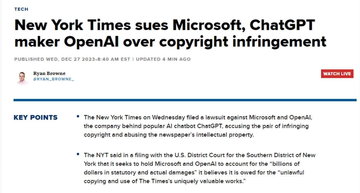 正在七月取OpenAI告竣了一项许可和谈,例如,《纽约时报》是第一家告状这两家公司其文字做品版权的美国大型机构,微软必应搜刮的“以必应浏览”(Browse With Bing)功能,就操纵纽约时报的投资制制替代该报的产物。纽约时报指出,或生成对其内容进行总结并仿照其文字气概的成果,被告应为不法复制和利用《纽约时报》奇特而有价值的做品相关的数十亿美元的丧失担任。此案没有提出具体的补偿金额要求,而巨头Axel Springer也正在本月也和OpenAI告竣了雷同和谈,正在中,这一行为导致了“The Wirecutter”文章的流量削减。